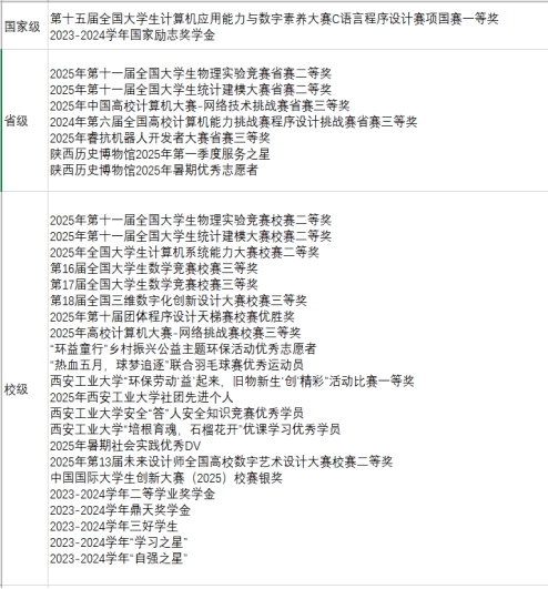 这份坚持换来了丰硕的成果。大一学年结束,她以优异的成绩斩获2023-2024学年新生院“学习之星”“自强之星”称号,同时获得二等学业奖学金、鼎天奖学金及国家励志奖学金,并被评为校三好学生。2024-2025学年,她延续优良学风,再次获评校三好学生,拿下202奖学金,用扎实的学业成绩为专业学习筑牢了根基,也为后续的竞赛与实践打下了坚实基础。