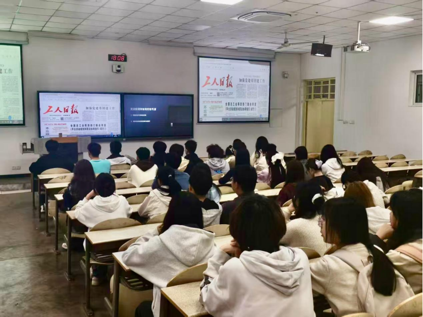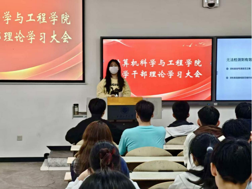 在教2-102召开团学干部理论学习大会。学院团委学生副书记孙雯晴主持会议并领学重点内容,学院全体团学干部参会学习。